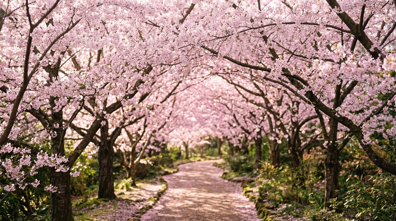 朝日が昇る静かな時間に、桜の花びらが風に揺れます。
