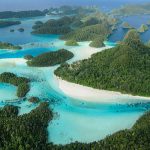 美しいブルーのグラデーション、白い砂には、カラフルな熱帯魚が美しいサンゴを彩り、巨大なマンタが優雅に泳ぐ青い海が広がっています。